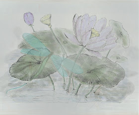 | The first idea was layering paper, an image from the +Karen Watson Graphics Fairy(Lily Pads), and my own image the Dragonfly. |