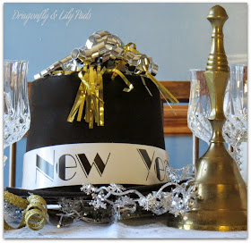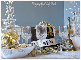 After purchasing a New Years Eve noisemakers, and a top hat at +Walmart for about Five bucks. I also hit +Jo-Ann Fabric and Craft Stores Clearance sale for Christmas purchasing silver and gold trinkets to add to the table. The other items were things I already owned.